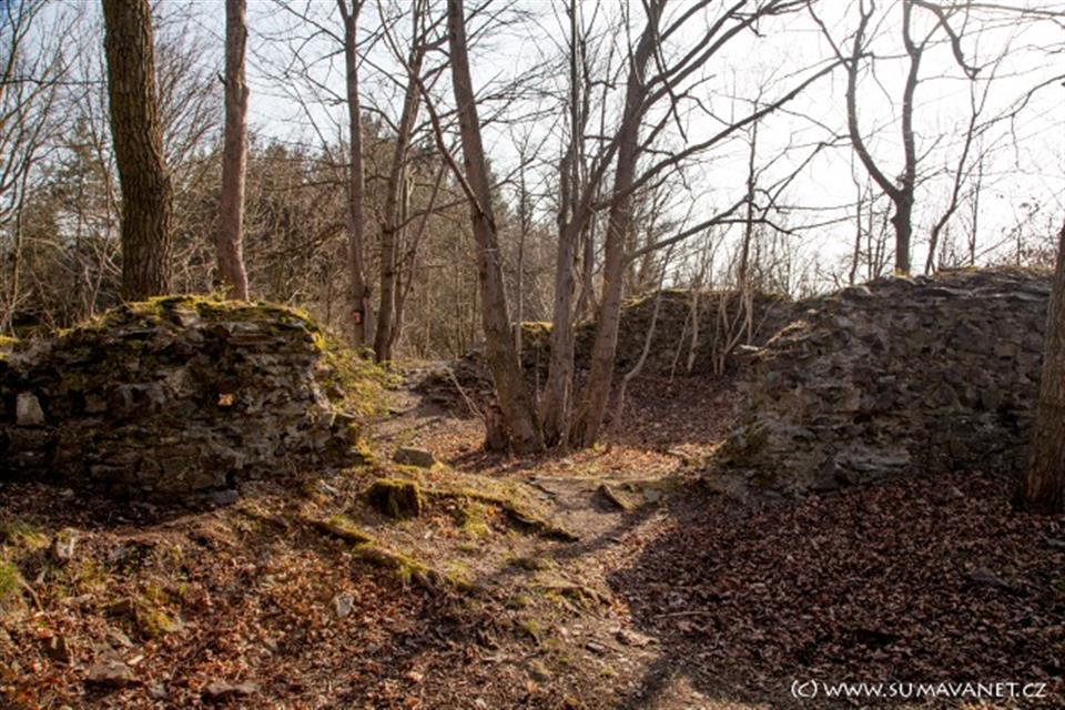 Zřícenina hrádku (tvrze) na strmém vrchu nad řekou Úhlava, 1,5 km od Švihova.