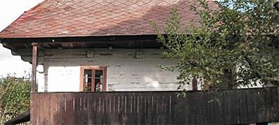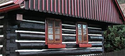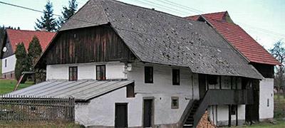 Příklad samostatně stojící chalupy šumavského typu z velkých neotesaných kmenů, pocházející pravděpodobně z 18. století…